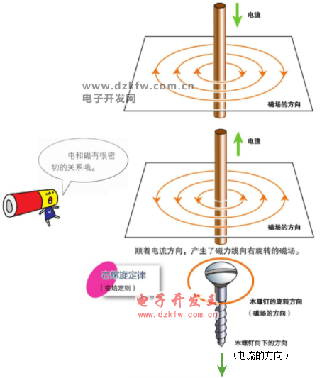 导线通电之后,在导线周围形成圆形的磁场,称为“磁效应”。顺着电流的方向,产生的磁场的方向都是向右转。如同拧紧木螺钉,需要向右旋转木螺钉,称为“右螺旋定律”。为了纪念发现该现象的人,也称为“安培定则”。