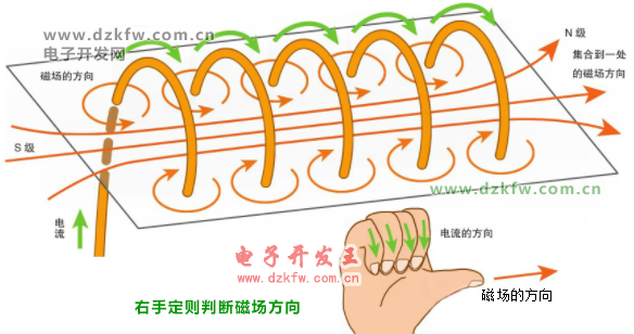 越接近电流或者电流量越大,磁场的磁感应强度就越强。右手螺旋定律: