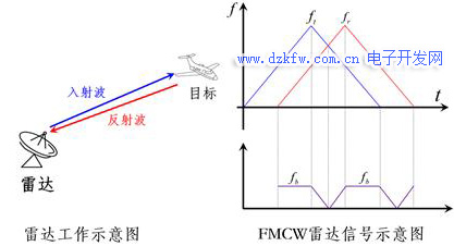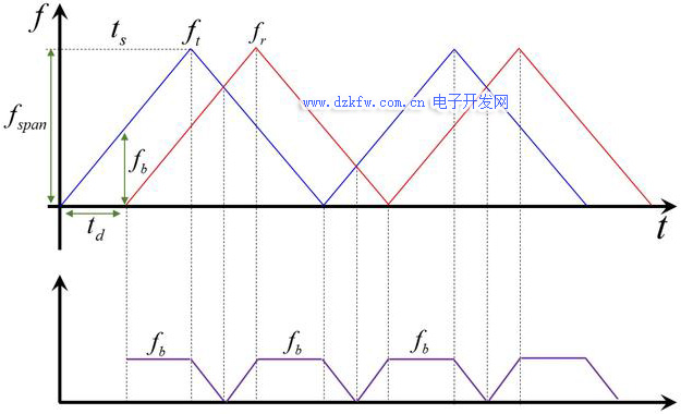 雷达发射频率随时间变化的三角波信号,该信号经目标反射之后被雷达接收。因为发射信号和接受信号之间有一定的时间差,并且发射信号的频率是随时间变化的;所以在发射信号和接收信号之间有一定的频率差;距离越大、频差就越大。通过频差和距离之间的某种关系,可以测得目标的距离。