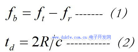 图(2)为FMCW雷达信号示意图;设发射的三角波为 、反射回来的波为 ,目标和雷达之间距离为R、发射波和接收波之间的延迟为 ;则任一时刻发射波和接收波的频率差为: