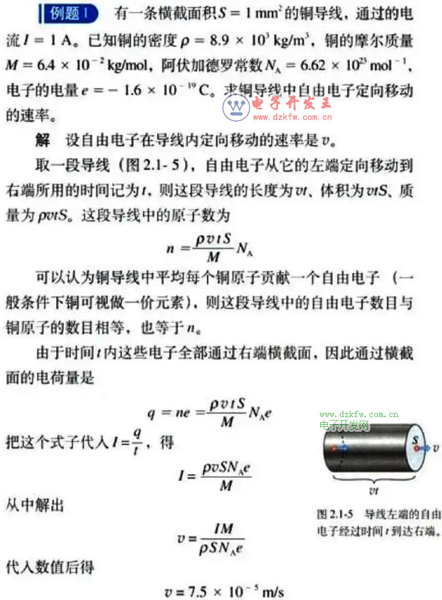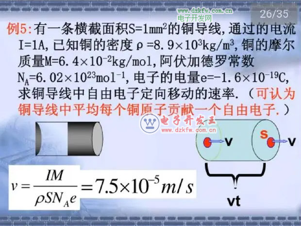那么,时间t内通过导线横截面的自由电子数n=ρSvtNA/M,其总电量Q=ne=ρSvtNAe/M。根据I=Q/t得,v=IM/ρSNAe,代入数字可得V=7.5×10-5米/秒,即0.75毫米/秒。
