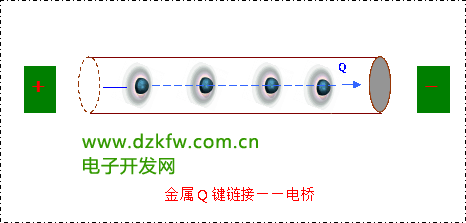 Q—M键理论认为,金属之所以具有导电性,与原子核的Q键链接有关。具体表述为,在外界电场作用下,原子核电场串联起来,构成一条电场传导通路——电桥,电场能通过电桥形成电流。需要说明的是,核外电子处于运动状态,其电场无法形成线性链接,因此,金属导电性与核外电子没有关系。原子核电场串联属于原子Q键链接的组成部分,因此称为Q键电桥,其传导电流过程,如图所示: