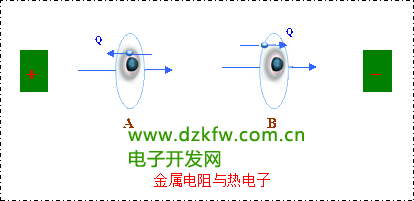 在原子内部,原子核与核外电子存在着质量场和电场双重作用,其中,原子核和核外电子的电场方向相反,参照图示:金属电阻与热电子(A)。
