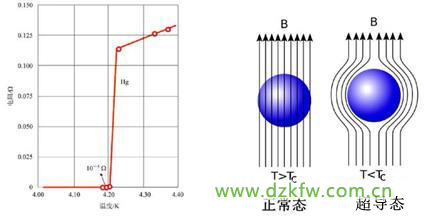 1911年,荷兰物理学家昂内斯发现,汞在温度降至4.2K附近时,导电性能突然进入一种新状态,电阻竟然消失了。后来发现许多金属和合金都具有这种特殊的导电性能,昂内斯称之为超导态。超导体的直流电阻率在一定的低温下突然消失,被称作零电阻效应。[1]