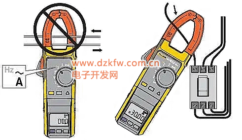 钳形电流表:无需断开电路,直接测量导线电流,导线需置于钳口中央。