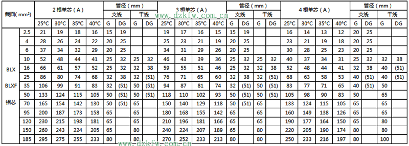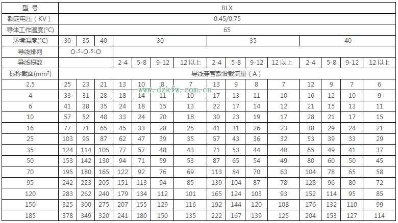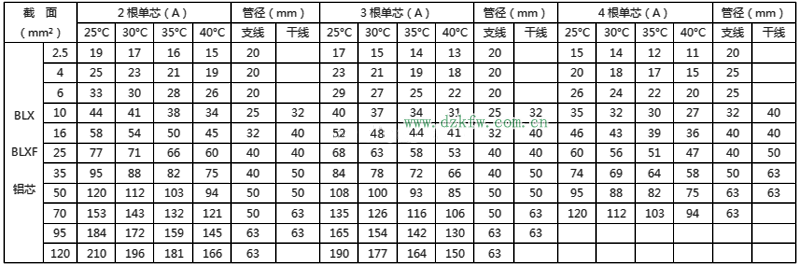 BLX绝缘电线明敷及穿线管时持续载流量对照表