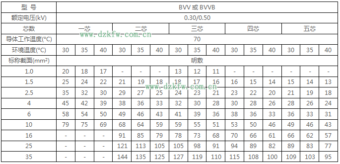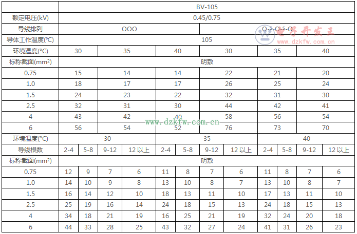 BV-105耐热聚氯乙烯绝缘电线的载流量对照表
