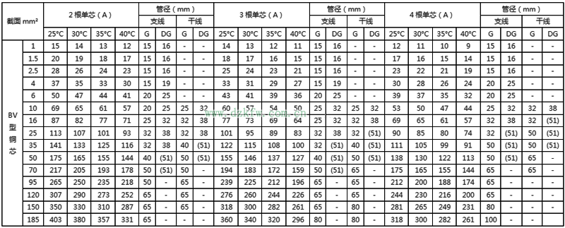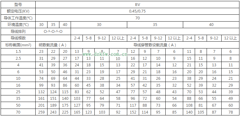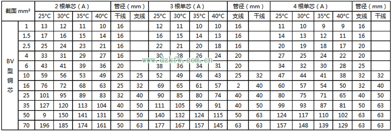 BV绝缘电线明敷及穿管时时持续载流量