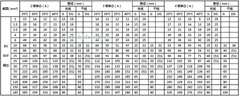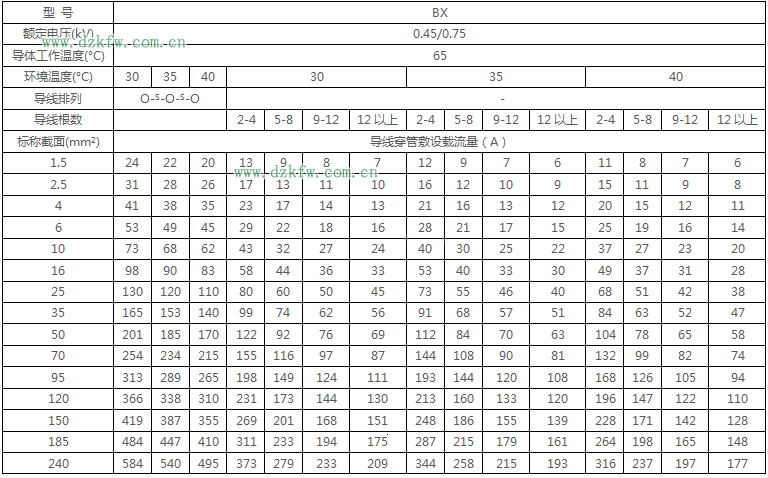 BX绝缘电线明敷及穿管时时持续载流量