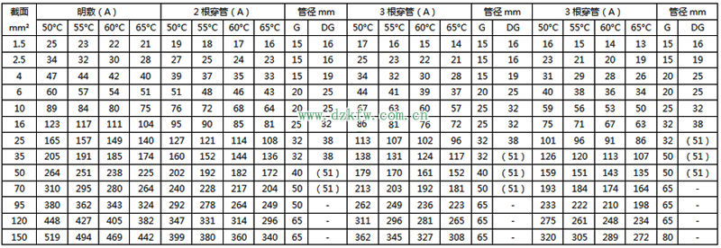 注:明敷载流量值系根据S>2De(De为电线外径)计算