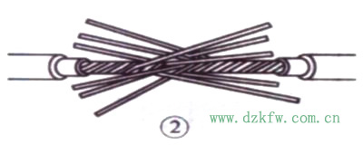 4)先在一端把邻近两股芯线在距叉口中线约3根单股芯线直径宽度处折起,并形成90°