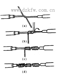 ① 单股铜芯导线的直接连接 先把两线端X形相交,如图1(a)所示;互相绞合2~3圈,如图1(b)所示;然后扳直两线端,将每线端在线芯上紧贴并绕6圈,如图1(c)、(d)所示。多余的线端剪去,并钳平切口毛刺。