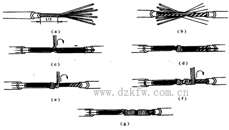 ④ 19股铜芯导线的直接连接 连接方法与7股芯线的基本相同,芯线太多,可剪去中间的几股芯线,缠接后,在连接处尚须进行钎焊,以增强其机械强度和改善导电性能。