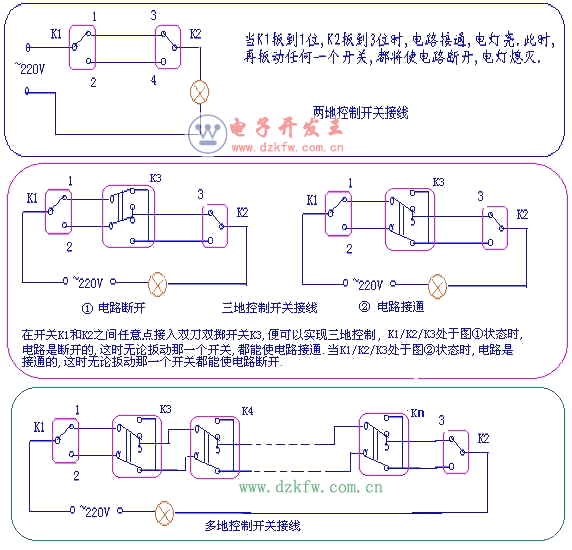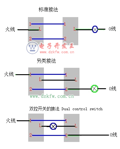 就一种,单联双控开关有三个接线端口,分别是上L1、中L、下L2,用两个单联双控开关就可以在不同的地方控制一个灯,接线方法:火线进任意一个单联双控开关的中L端,再把两个开关的上L1与上L1端口相连,下L2与下L2端口相连,然后再由另一个单联双控的中L端出一根控制线到灯头,就可以了.