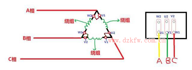 先不说别的,单单看上图黑线是不是很像一个三角形啊,所以叫三角形接法不是随便说的。对看过我昨天写的三相交流电的人来说这个图应该很容易理解。从图中也可以看出三相交流电机是有三个绕组的(绿色的部份表示绕组),每个绕组首尾各一条线,分别和另外一个绕组依次首尾相连,绕组的W2和另外一个绕组U1相连接组成A相,V2和W1相连接组成B相,U2和V1组成C相。从图中看就是把三个绕组串联起来,然后在每个相连的点引出作为三相电的三个相线也就是A相B相C相。而且也没有零线引出。这样接有什么好处呢?