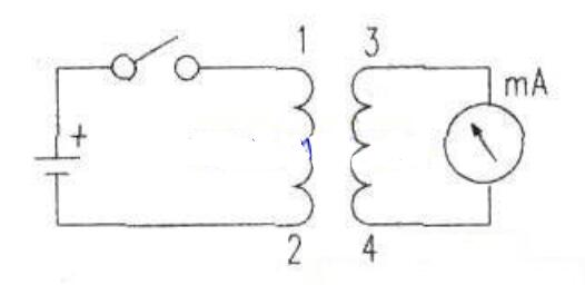 按下图接线,接通开关,在通电瞬间,注意观察电流计指针的偏转方向,如果电流计的指针正方向偏转,则表示变压器接电池正极的端头和接电流计正极的端头为同名端(1、3);如果电流计的指针负方向偏转,则表示变压器接电池正极的端头和接电流计负极的端头为同名端(1、4)。注意测试时人体不要触及变压器端子,防止被电击。采用这种方法,若变压器的升压绕组(匝数较多的绕组)接电池,电表应选用最小量程,使指针摆动幅度较大,以利于观察;若变压器的降压绕组(即匝数较少的绕组)接电池,电表应选用较大量程,以免损坏电表。