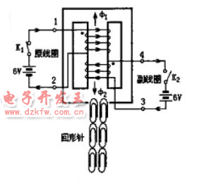 首先闭合开关k1,全线圈产生磁通量φ1,在变压器硅钢片的端头产生了较强的磁场,可以吸住一圈回形针,然后闭合次级线圈开关k2,在k2闭合的瞬间若回形针掉落,表明相加磁场变弱。反之表明磁场变强。通过以上叙述
