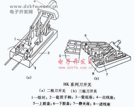 下图为HK系列刀开关结构图,该开关由闸刀、熔丝、接线座、胶盖及瓷底座等组成。胶盖的作用是防止操作人员触及带电部分;防止电弧飞出胶盖外灼伤操作人员;防止金属物件掉落在闸刀上产生极间短路;并且将各极隔开,防止极间飞弧导致电源的短路。