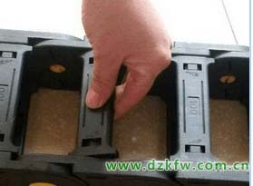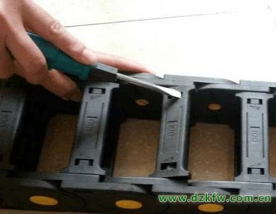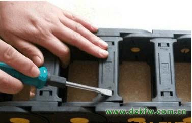 拖链的安装的工具很简单一个平头螺丝刀即可。拖链表面都有开启空,用准备好的平头螺丝刀垂直插入盖板两端的开启孔中,稍微用力即可打开盖扳,将电缆、油管等按照合理的的放置原则,放入电缆拖链内部,然后盖上盖板,很简单的就操作完成了。下面就是固定了,每种都备有安装孔,装配很便捷,值得注意的是电线的固定端和活动端均应去张力装置加以固定,以达到更好的保护。