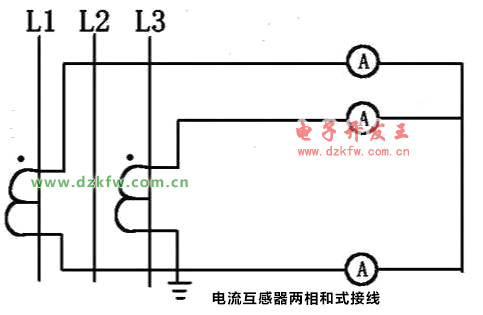 两台互感器V形接线,测量对称和不对称三相三线电路中电流。三相电流矢量和为零,所以最下面电流表测量的是未装互感器那相的电流。此接法在实际工作中用得最多,它节省了一台电流互感器。这种接线方式能反应相间短路,但不能完全反应单相接地短路,所以不能作单相接地保护。这种接线方式用于中性点不接地系统或经消弧线圈接地系统作相间短路保护,也可在继电保护中应用,但灵敏度低。