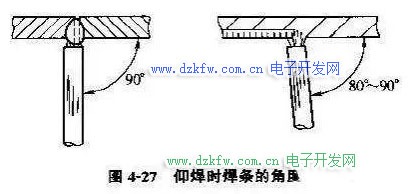 (2)当焊件的厚度为4mm左右时,仰焊可采用不开坡口的对接焊,焊条直径为3.2mm,焊条与焊缝两侧成90°夹角,与焊接方向保持80°-90°的夹角,如图4-27所示。在整个施焊过程中,焊条要保持在上述角度均匀地运条。