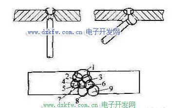 (5)图4-29为对接仰焊时多层多道焊焊缝的排列顺序。操作时,焊条的角度应根据每一道焊缝的位置作相应的调整,以利于熔滴金属的过渡,并能获得较好的焊缝成形。