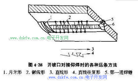 (4)当焊件厚度大于5mm时,对接仰焊均开坡口。对于开坡口的对接仰焊打底层焊接的运条方法,应根据坡口间隙的大小,决定选用直线形或往复直线形的运条方法。其后各层均宜用锯齿形或月牙形运条方法。如图4-28所示。在进行仰焊时,无论采用哪种运条手法,均应形成较薄的焊道。焊缝表面要平直,不允许出现凸形。