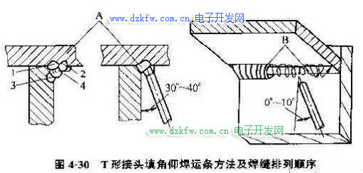 T形接头填角仰焊的运条方法如图4-30所示。如果填角仰焊操作技术熟练,可使用较大直径的焊条和稍大的焊接电流,以提高工作效率。