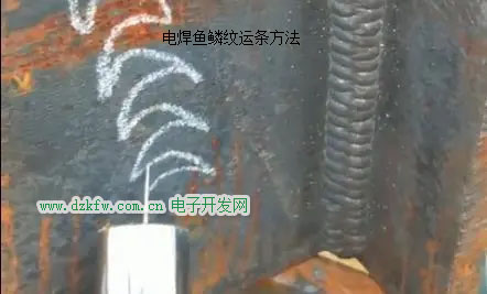 焊接铁水随着运条走向先后冷却,焊接盖面过程中,焊缝两边焊接时间多于焊缝中间焊接时间,铁水冷却后形成左一片右一片鱼鳞似的焊纹。