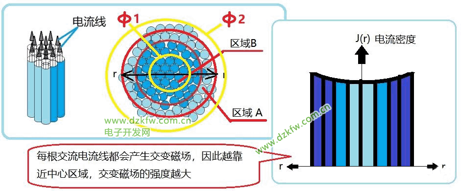 因此,越靠近导体中心,交变磁场在导体内所产生的感生电动势就越强,其阻碍原电流变化的作用就越强,其结果就导致了导体内部中心部位的电流密度J(r)比导体外部部位要低,见图1右侧的图像。
