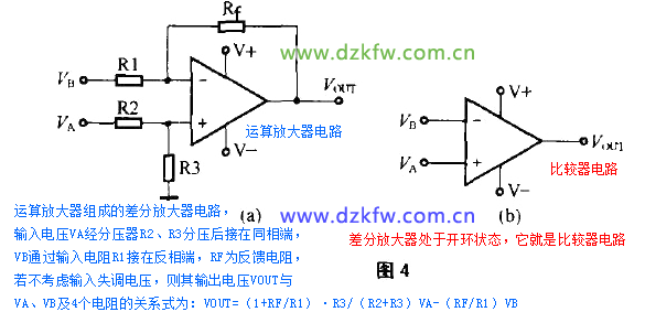 如下图所示,是由运算放大器组成的差分放大器电路,输入电压VA经分压器R2、R3分压后接在同相端,VB通过输入电阻R1接在反相端,RF为反馈电阻,若不考虑输入失调电压,则其输出电压VOUT与VA、VB及4个电阻的关系式为:VOUT=(1+RF/R1)·R3/(R2+R3)VA-(RF/R1)VB。若R1=R2,R3=RF,则VOUT=RF/R1(VA-VB),RF/R1为放大器的增益。当R1=R2=0,R3=RF=∞时,VOUT=∞。增益成为无穷大,其电路图就形成(B)图的样子,差分放大器处于开环状态,它就是比较器电路。