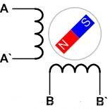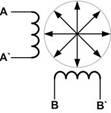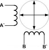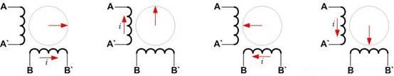 如下图是两相步进电机的内部定子示意图,为了使电机的转子能够连续、平稳地转动,定子必须产生一个连续、平均的磁场。因为从宏观上看,电机转子始终跟随电机定子合成的磁场方向。如果定子合成的磁场变化太快,转子跟随不上,这时步进电机就出现失步现象。