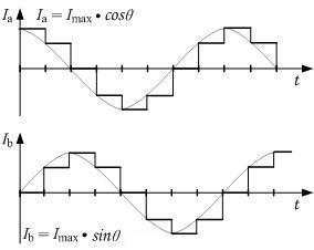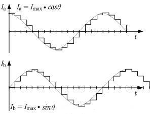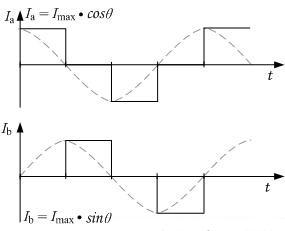下图是整步驱动方式的A、B相的电流I vs T图: