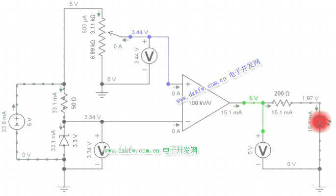 其次,调节可变电阻,使其两端电压小于3.37V,比如2.09V,作为运放正相输入,由于电压小于反相输入,LED不点亮。