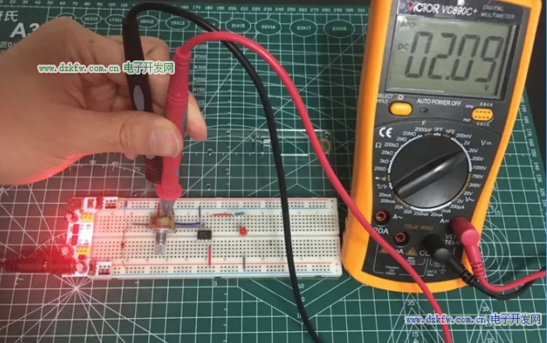 图10-万用表检查可变电阻两端电压,大于反相端,LED点亮