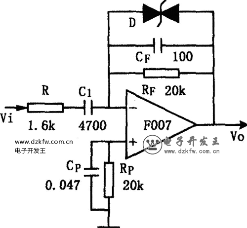 如图所示为低噪声微分电路。该电路是在基本微分器基础上增加少量元件,从而具有过载保护能力,稳定性好且噪声低。R的接入能使电路稳定,并起减小噪声和增大输入阻抗的作用。在微分器工作频率不高时,为了更好的抑制高频噪声,加了电容Cp。稳压管D是考虑有可能突然出现很大的单极噪声而设置。Cp是用于将Rp上的热噪声旁路,并能保持回路稳定。