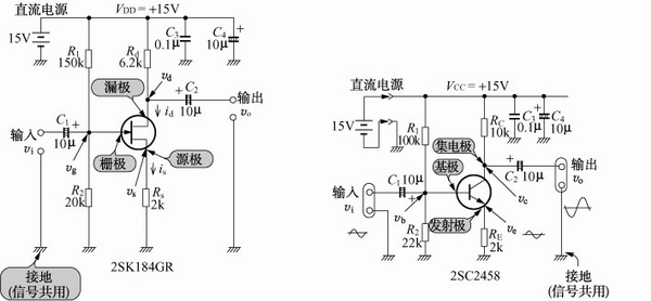图2.2是使用双极晶体管的发射极接地放大电路。可以看出两个电路中的电路常数不太相同,图2.1的电路是将图2.2电路中的双极晶体管用FET置换的电路。