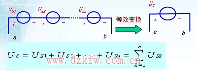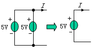 如果USk的参考方向与右图中Us的参考方向一致时,式中USk的前面取“+”号,不一致时取“-”号。 2.并联 只有电压相等极性一致的电压源才允许并联,否则违背KVL。其等效电路为其中任一电压源,但是这个并联组合向外部提供的电流在各个电压源之间如何分配则无法确定。