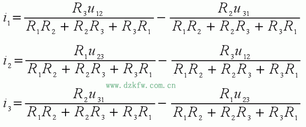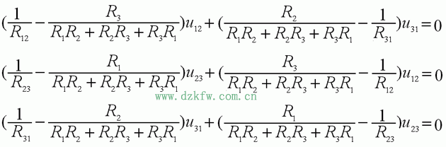 - 对于任何的u12,u23,u31,上式都要成立,只能是其系数等于 0 ,由此解得Y-△的等效电阻公式: