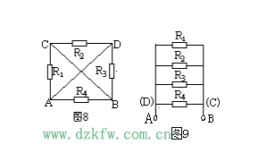 例4.如图8所示,已知R1=R2=R3=R4=2Ω,求A、B两点间的总电阻。