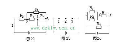 仍以图13为例,设电流由A端流入,B端流出,先撤去R2,由图16可知R1、R3有电流通过。再撤去电阻R1,由图17可知R2、R3仍有电流通过。同理撤去电阻R3时,R1、R2也有电流通过由并联电路的特点可知,R1、R2和R3并联,再与R4串联。