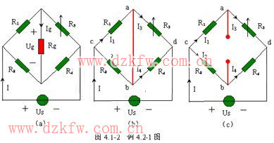 例 4.2-1 图 4.2-2 ( a )所示电路为电桥电路,当通过电阻 Rg 的电流 Ig=0 时,电桥达到平衡。 Us=4.5V , R1=1K Ω, R2=10K Ω, R3 为可变电阻, R4 为被测电阻,现调节电阻 R3 ,当 R3=0.5K Ω时 , 电桥达到平衡。求被测电阻 R4 及电压源供出的电流 I 。