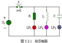 图 5.2-1 所示电路中, LP1 、 LP2 和 LP3 是三个白炽灯,它们分别与电阻 R 、电容 C 和电感 L 相串联,并通过开关 S 接到直流电压源 Us 上,开关 S 闭合之前,三个灯泡都不亮。