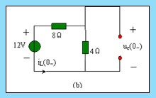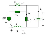 解: 1. 时电路已处于稳态,由于 12V 直流电压源激励,根据电容、电感的性质,可将电容视为开路,将电感视为短路,且开关 S 断开,作出 t=0 -时刻的等效电路,如图 5.2-2 ( b )所示。由图 5.2-2 ( b )可知,