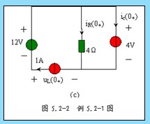 3 . t=0 +时刻,由替代定理,用 4V 电压源替代电容 C ,用 1A 的电流源替代电感 L ,且此时开关 S 闭合,得 t=0 +时刻的等效电路,如图 5.2-2 ( c )所示。