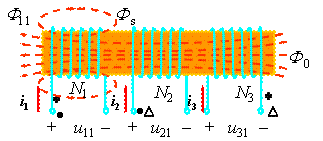 图1所示的耦合电感中,两两同名端用相同的符号表示,如 *、△、·。通过同名端的确定,得到