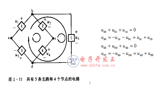 KVL可以从由支路组成的回路,推广到任一闭合的结点序列,即在任一时刻,沿任一闭合结点序列的各段电压(不一定是支路电压)的代数和等于零。对图l-11电路中闭合结点序列abca和 abda列出的 KVL方程分别为: