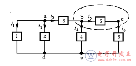 图示电路中,a、b、c点是结点,d点和e点间由理想导线相连,应视为一个结点。该