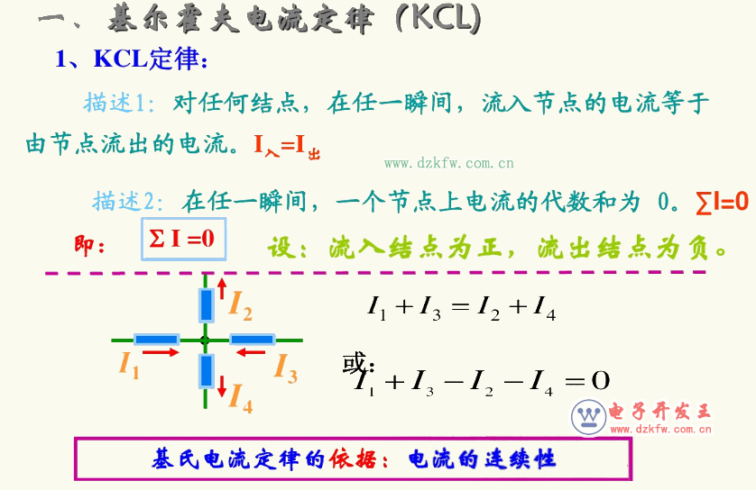 其中,基尔霍夫第一定律为基尔霍夫电流定律第二定律为基尔霍夫电压定律,基尔霍夫电流定律(KCL) 任一集总参数电路中的任一节点,在任一瞬间流出(流入)该节点的所有电流的代数和恒为零,即就参考方向而言,流出节点的电流在式中取正号,流入节点的电流取负号。基尔霍夫电流定律是电流连续性和电荷守恒定律在电路中的体现。它可以推广应用于电路的任一假想闭合面。基尔霍夫电压定律(KVL)任一集总参数电路中的任一回路,在任一瞬间沿此回路的各段电压的代数和恒为零,即电压的参考方向与回路的绕行方向相同时,该电压在式中取正号,否则取负号。基尔霍夫电压定律是电位单值性和能量守恒定律在电路中的体现。它可推广应用于假想的回路中。