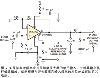 在该电路中,运算放大器的输出为:VOUT(t)=VIN(t)×G(t),其中VIN(t)=A cos(wREFt+q),G(t)为运算放大器的时变增益。G(t)是50%占空比的方波,它以相位参考信号的频率从0切换至G0。G0是运算放大器被启用时的增益。由于G(t)是时变周期函数,因此把它扩展成傅里叶级数:G(t)=G0[1/2+2/p{cos(wREFt)-1 /3cos(3wREFt)+1/5cos(5wREFt)+…}]。把VIN(t)乘以G(t),并只保留DC项,则输出的DC分量为 VOUT(dc)=(AG0/p)cos(q)。图1中的EL5100运算放大器具有200MHz单位增益带宽,并且如果把至少为0V~4V的方波施加到输出禁用端子(引脚8),就能通/断该放大器的输出。利用所示的反馈电阻,并且G0=3,检相器的峰值输出电压约等于输入信号的峰值。EL5100的禁用时间为180ns,启用时间为650ns,这使人们能按大约250kHz频率开关该器件的增益。在更高频率时,检相器的增益下降,这是因为增益开关不再具有50%占空比。